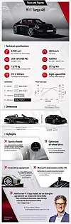 Bilen kommer i to utgaver, som Targa 4 og Targa 4S. Som du skjønner av betegnelsene er begge utstyrt med firehjulsdrift.Targa 4S kan skryte av hele 450 hestekrefter, en økning på 30. Samme forhold kan benyttes når vi snakker om dreiemomentet som er 530 Nm ved 2300-5000 o/min. Her er aks-tiden barbert med fire tideler til 3,6 sekunder. Åttetrinns dobbel clutch girkasse – PDK i Porsche-vokabularet – og intelligent firehjulsdrift (PTM) er standard i begge modeller. Som alternativ kan Targa 4S bestilles med en nyutviklet 7-trinns manuell girkasse – da er Sport Chrono-pakken inkludert.Elektronisk variabelt chassis (PASM) er standard i begge modeller. Systemet justerer dempingen i forhold til komfort og dynamikk etter kjøresituasjon. Føreren kan eventuelt selv velge mellom Normal og Sport.
