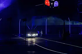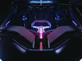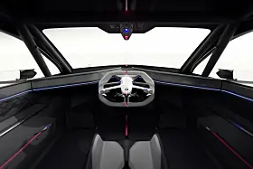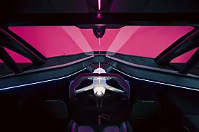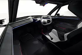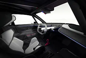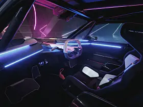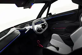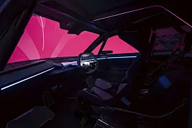 Innvendig er det mørkt med blått og rosa og et ratt som ikke er særlig rundt, men nærmere et rektangel. Regn med at det tar samme veien som førerplassen: på dynga. Dessuten må vi vel dessverre regne med flere skjermer enn de vi finner på konseptbilen.