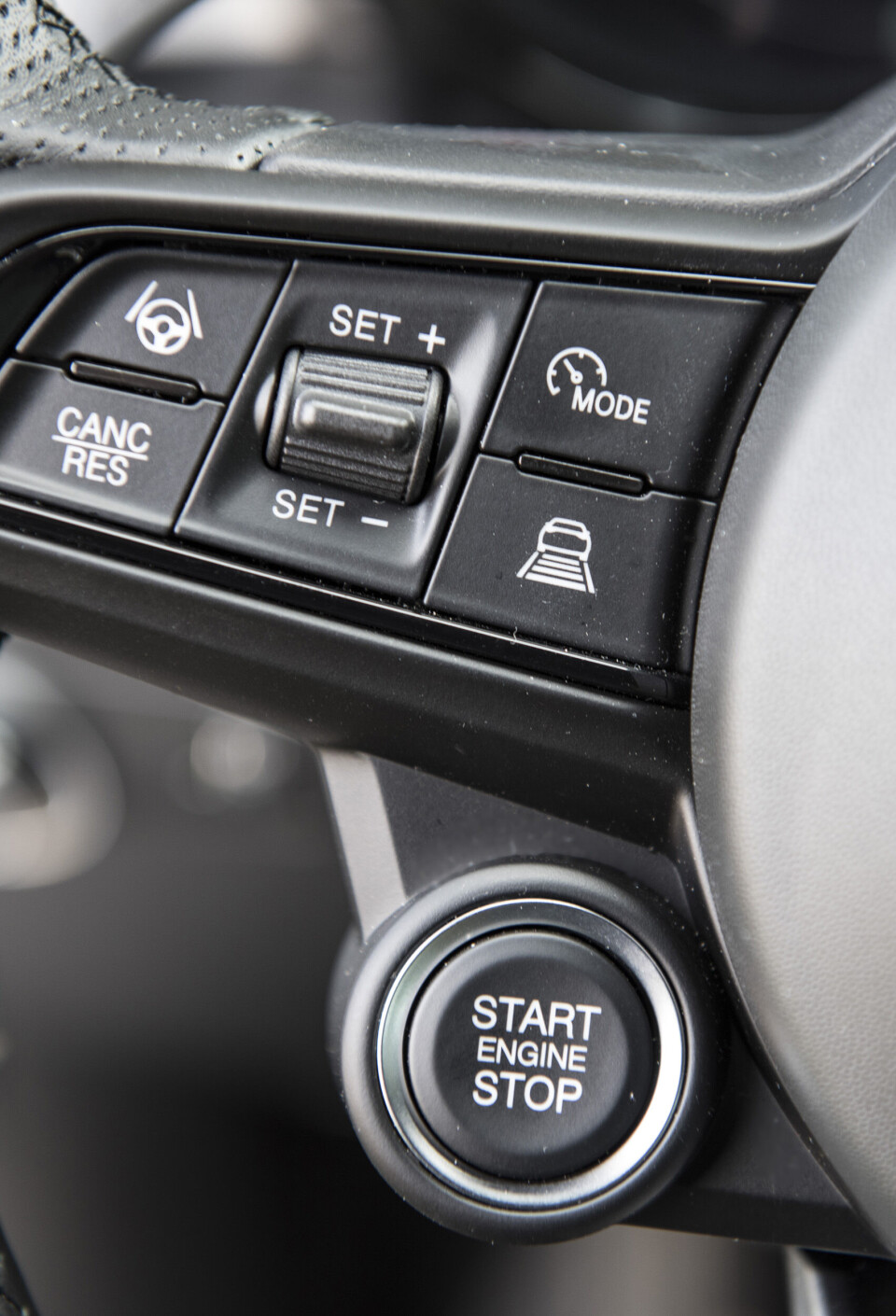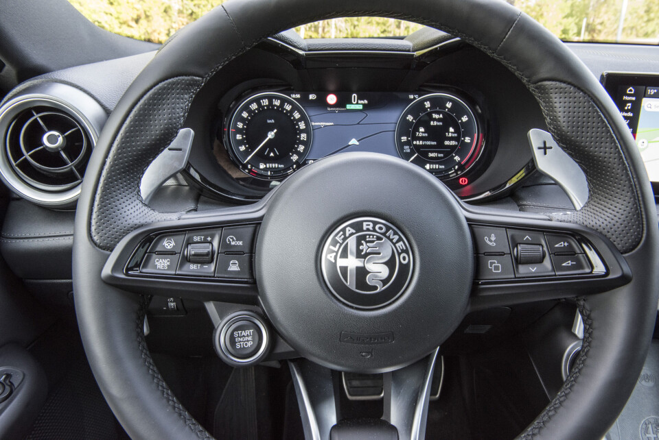 I Alfa Romeo Tonale forsterker det kullsvarte interiøret det sportslige preget selv om testbilen bare var utstyrt med grå logo i hodestøtene, ikke Alfas dype rødfarge. Men startknappen på rattet er der sammen med kjøreprogramhjulet på venstre side av midtkonsollen.