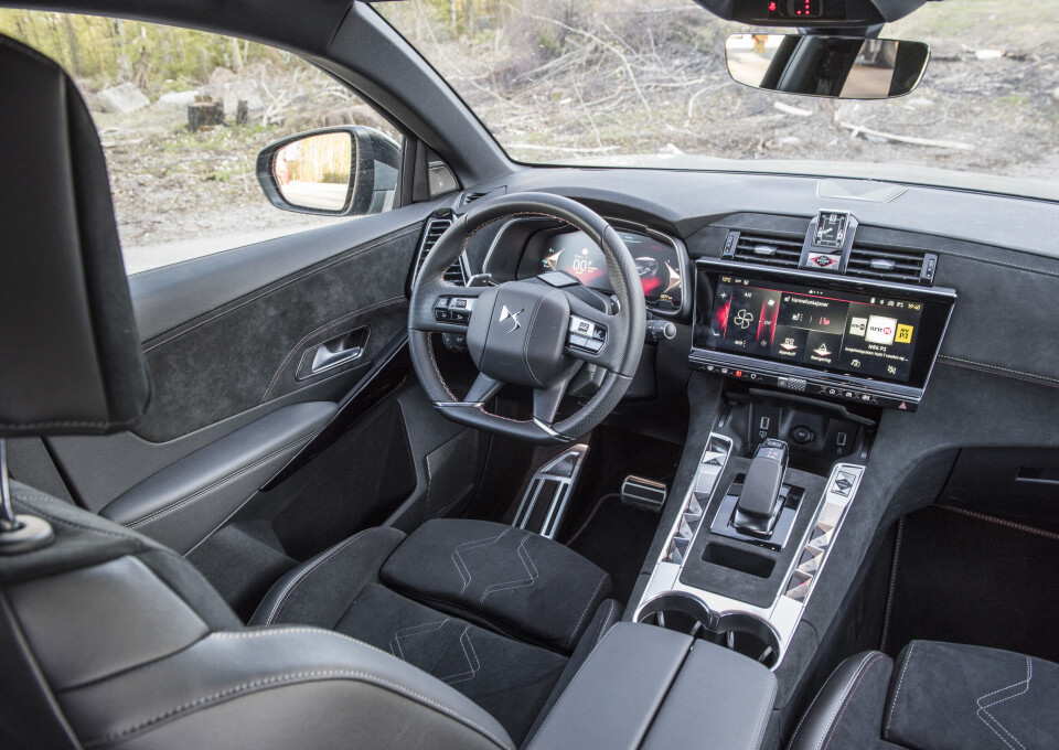 DS 7 stiller med et gedigent interiør, elegant utformet, materialer som er gode å ta på, digre skjermer, mange bildevalg på dashbordskjermen, god grafikk og detaljer en premium bil verdig