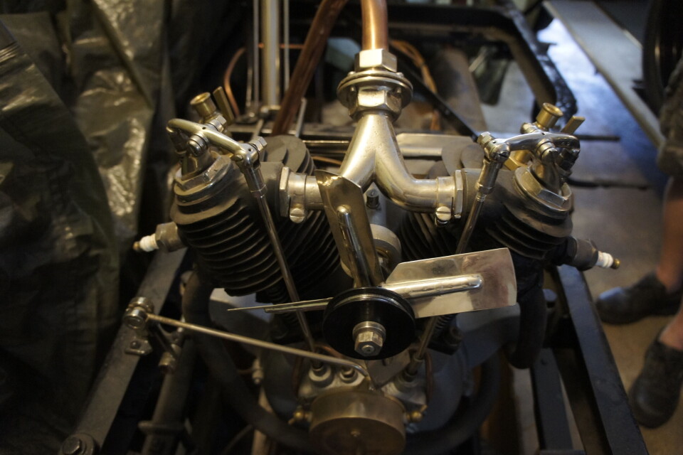 Alt gjør han selv, bygger deler som mangler, graver opp dokumentasjon, snekrer rammeverk og banker karosserier, sporer opp reservedeler fra hele verden, syr seter og interiør, støper dekorasjoner – som storkene på sidene av denne bilen – gjerne to ganger hvis han syns første forsøk ble mislykket, og kjører dem med en mekanisk følsomhet som om han skulle vært en del av bilen.
