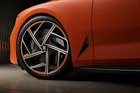 Eksemplaret på bildene er lakkert i oransje Vermillion Gloss, og fargen går igjen i grillen hvor den fades over til sort, og som kontrastfarge i de 22 tommer store felgene.