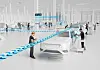 Der står bilen bom stille, og beveges ikke langs et bånd, mens alt arbeidet utføres på stedet, med førerløse handlevogner som bringer de nødvendige komponentene.