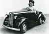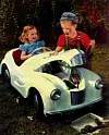 Tilbake til Goodwood. Hadde virkelig brukerne av disse bilene hvit racing-overall når de flådde rundt i parkanleggene sine i 1950-årene? På de brosjyrebildene jeg har fra den tiden har jentene bluse og sløyfe i håret, gutten som sitter oppi Pathfinderen har jommen hvit, kortermet skjorte og slips, mens han som blir stoppet av en lekepol’ti har en olivenfarget skjorte som ser ut som den er åpen i halsen.