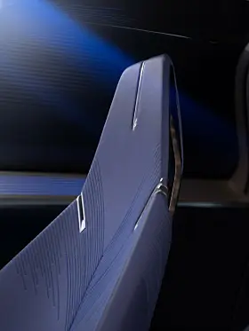 Når du går mot bilen åpner dørene seg, og du ser et svært clean interiør i noe mørkt og blått. Intrikate sømmer i setene er med på å gi antydninger til opulens.