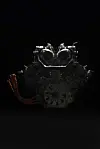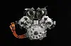 Fire-literen er hva han kaller en «hot V» med de to turboene montert mellom sylinderblokkene. Du finner 180 graders veivaksel, titan i stempelstangen, sentral innsprøytning og lette vippearmer – alt medvirker til et turtall i avansert motorsykkel-område på rundt 10.000.