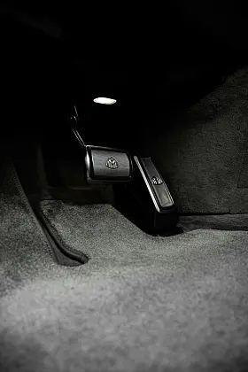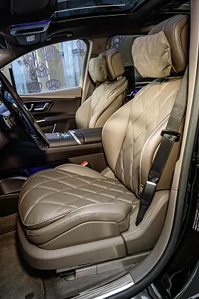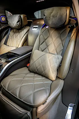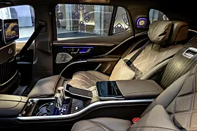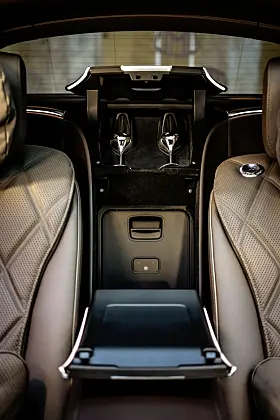 Fra baksetet har man tilgang til en forlenget senterkonsoll med to termiske koppholdere. Fire USB-C porter og to HDMI-porter er også på plass. Som tilleggsutstyr kan senterkonsollen utstyres med sammenleggbare bord, kjøleskap og champagneglass.