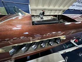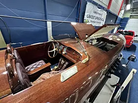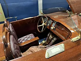 Ja, selv en båt har fått plass, men ikke en hvilken som helst. For dette smykket i tre har en cockpit som minner mest om et bilinteriør der eier Rune Hove kan skue mot et panser som skjuler en Rolls-Royce stridsvognmotor. Bare synet av og lydopplevelsen når en kraftig pickup tauer båten ut i friluft og Hove fyrer de 12 sylindrene med så korte rør at den spytter flammer, er verd besøket på Autopia.