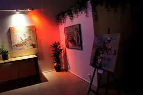 Mens hovedgalleriet har sine faste kunstnere til faste tider var denne bensin&blod-øvelsen i et filial-lokale (tidligere bilverksted) bare ment som en pop up – pop down. Som et slags meeting, nytes og ferdig med det.