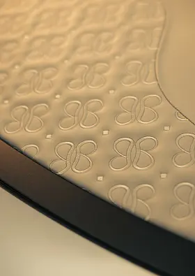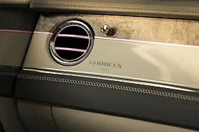 Du finner også en rekke innslag av rosa i interiøret, og på midtkonsollen er det innfelt en pendant i 18 karat hvitt gull med diamanter utformet som B-er. Rosa er også representert i luftdysene som er innrammet i gull.