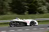 Bakhjulet kommer fra en Le Mans-bil og sitter på et sett med motorsykkellignende svingarmer med en Öhlins demper. Så der sitter jeg – med hjelm – uten dører eller frontrute – stroppet fast til et polystyrensete polstret med gaffatape.