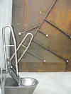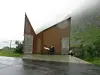 Rasteplassen i seg selv var et syn, med benker og bord i granitt og betong, men det var potta som tok prisen. To taggete bygg i noe som så ut som ferdigrustede jernplater med innslag av stål.
