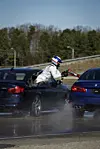 Men i dette tilfelle skjedde tilkobling og tanking manuelt. En annen bil med instruktør Matt Mullins bak rattet driftet side om side med Schwartz mens Matt Butts fra Detroit Speed sto for selve tankingen ved å lene seg ut gjennom vinduet.