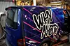 Og litt veldig god hjelp fra firmaer som også tente på ideen. Det er en og annen sponsor der nå, på siden av den elektrisk-blå bilen.