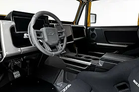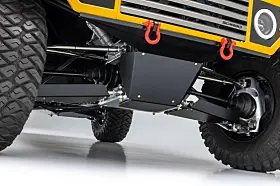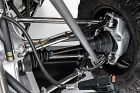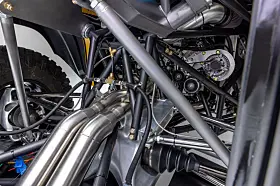 I midten/bak ligger det en V8 motor på 1100 hester med en 8-trinns girkasse, låsbar diff foran og bak, forehjulsstyring med 40 tommers offroad-dekk som stoppes av karbon-skiver og en justerbar pushrod-opphengning – ren racerbil egentlig – som sitter godt innabords og som kan gi deg inntil 75 cm fjæringsvei.
