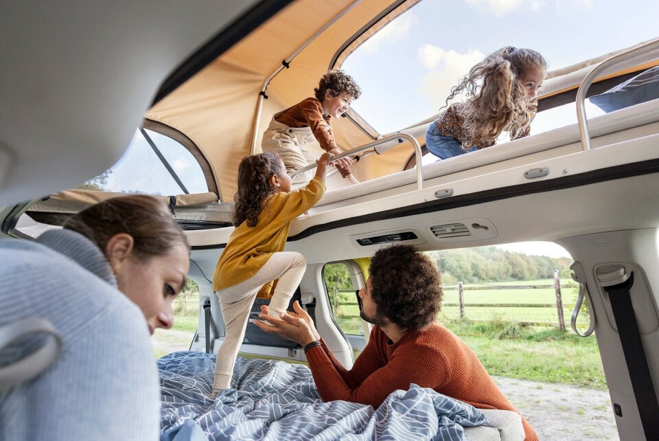Men i stedet for et vanlig hevetak har Tonke redesignet løsningen på sin Buzz Trail slik at taket brettes til siden av bilen og danner gulvet i et telt. Her er det plass til en madrass på 140 x 210 centimeter som gir plass til inntil tre barn forutsatt at de er små nok.