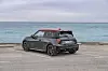 JCW-pakken inneholder en spesiell oktagonal grill i sort høyglans med målflagget integrert, fartsstriper på panseret og 18-tommers, to-tonede spesialfelger. Tak og speilhus er lakkert i Chilli Red.
