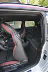 Også innvendig er det tøysete i en JCW. Speedometeret er flyttet fra midten på dashbordet og inn foran rattet. Det komisk lille instrumenthuset flytter seg med rattstammen, og har en liten turteller til venstre og en latterlig bensinmåler (med bare åtte trinn!) til høyre for speedo’n.