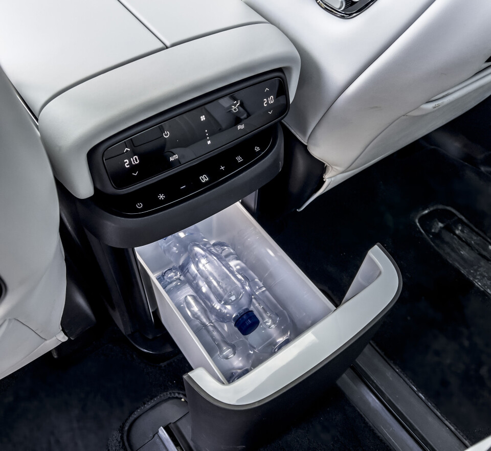 Med fjernkontrollen felles den 21,4 tommer store flatskjermen ned fra taket samtidig som jeg plukker opp kalddrikke fra bilens store kjøleskap skjult i bakkant av midtkonsollen.
