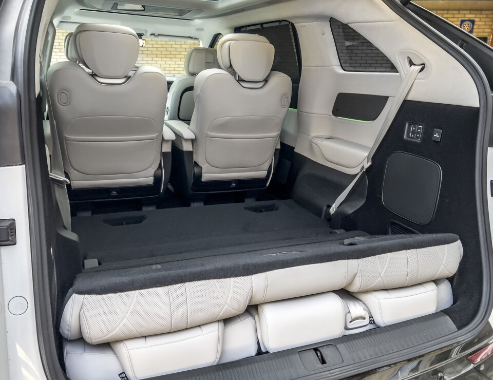 Når tredje seterad pakkes sammen skjer det ved at hodestøttene først senkes, altså elektrisk. Så felles ryggene fram, hele setepakkes snus 180 grader bakover og senkes deretter ned i en brønn til flatt gulv.