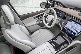 Fordi du vet at EQE 350 sprinter til 100 på 6,6 sekunder, er det deilig å kunne lene seg tilbake i de gråhvite og ventilerte veganskinnsetene med massasje, kjøre mykt og vinke fram de utålmodige i visshet om at 292 hk og 765 Nm i drakraft holder i massevis til forsvarlige forbikjøringer