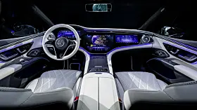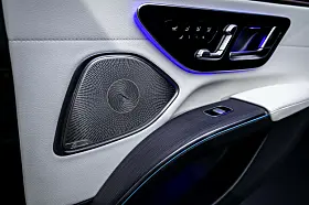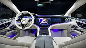 MBUX Hyperscreen, den store buede skjermenheten, som under en felles glassflate visuelt smelter sammen tre skjermer til en, er nå standard på EQS. Varmepumpe øker klimakomforten og effektiviteten og er nå også standard. Spillvarmen fra den elektriske enheten og høyvoltsbatteriet kan derfor brukes til å varme opp interiøret, noe som reduserer strømforbruket og øker rekkevidden.