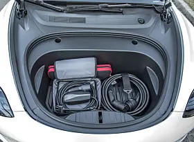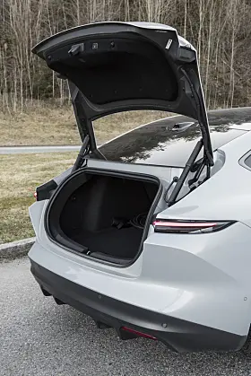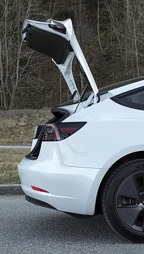 Tesla oppgir 561 liter, men det inkluderer et stort rom under gulvet som naturlig nok kan brukes til å legge fra seg mange små ting, men er til lite hjelp når store kolli må fraktes hjem. 88 liter foran er kjekt til ladekabler, eller skittentøy etter en lang tur i dårlig vær.
