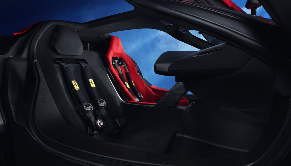 Det man heldigvis også kan se av bilder er at de aller fleste kontrollorganer, både på rattet og på den smale senter-konsollen er fysiske og – sier Ferrari – enkle å bruke under transport.