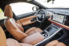 I likhet med flere nye biler er det ikke en knapp på midtkonsollen, kun et stort rom og ladeplass til to telefoner. Her er ingen startknapp, kun å sette seg inn å kjøre. En «flytende» instrumentskjerm inneholder det mest nødvendige av kjøreinformasjon, mens en stor, horisontalt montert infotainmentskjerm henger sammen med en tilsvarende passasjerskjerm hvis innhold ikke er synlig fra førerplass.
