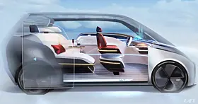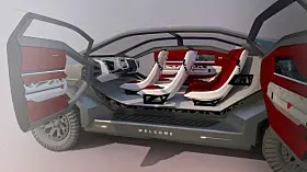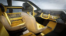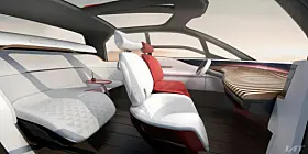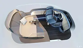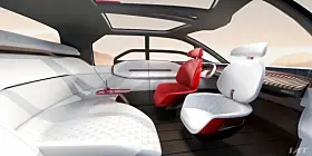 Setene foran kan roteres og baksetet kan flates helt ned. Foran og bak er det store skjermer på utsiden som skal gjøre det greit å bli venn med omgivelsene ved hjelp av aktiv interaksjon.