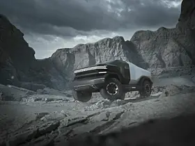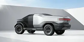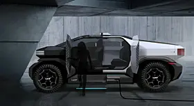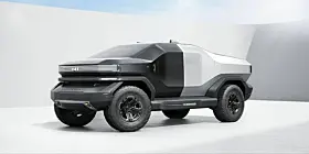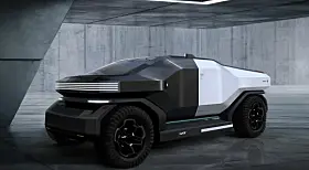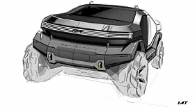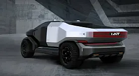 Den ene heter Truck Mad – en futuristisk pickup, så cross country at han har montert den inn på noe som ser ut som et Mars-landskap. Spennende kontrast mellom piano-svart front og matt, hvit hekk.