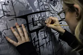 En dørplate der kunstverket egentlig består av perforeringer – 7700 av dem, gjennom et spesielt skinn som er dekket av en grå overflate. Resultatet blir et helt spesielt bilde som skal illustrere en skimrende Themsen som renner gjennom London sentrum.