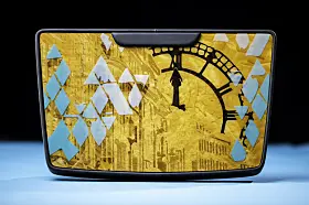 Det er kjente bygninger som blir antydet der, sammen med en fraksjon av Big Ben. En eneste fagmann har jobbet med denne. Han brukte mer enn 50 timer på å skjære ut, legge sammen og presse perfekt tilpassede trevarer før det ble lakkert.