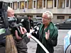 Men hun tar også lystig utfordringen med å sette seg inn på den gale siden av bilen og styre den gjennom tett Oslo-trafikk.