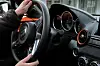 Topp-panelene i dørene er lakkert i bilens farge, noe som gir en ‘roadster-følelse’ på en måte – at eksteriøret blir med inn i kupeen. Rattet er lite men tykt, og har en oransje søm på toppen. Mazda – inviter meg gjerne på bane-kjøring!