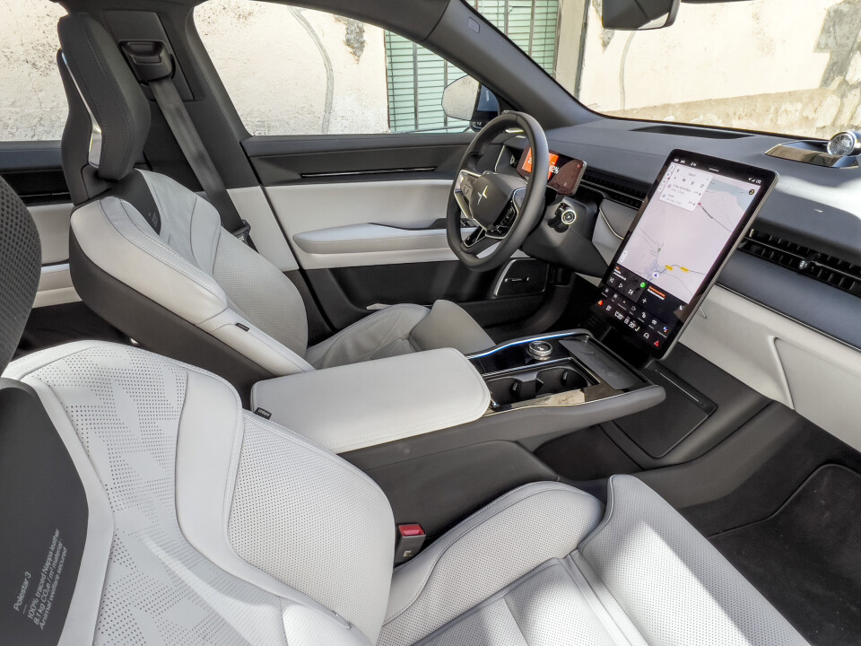 Under dekke av nordisk enkelhet er førermiljøet nær så minimalistisk utformet som mulig. Der Polestar 4 har breddemontert dashbordskjerm, er den høydemontert i Polestar 3 med de fordeler det gir for kartvisning og ulemper ved at innstillingsfunksjonene for klimaanlegget befinner seg forholdsvis lavt. Ved å feste den lille instrumentskjermen til rattstammen, følger skjermen rattjusteringene.